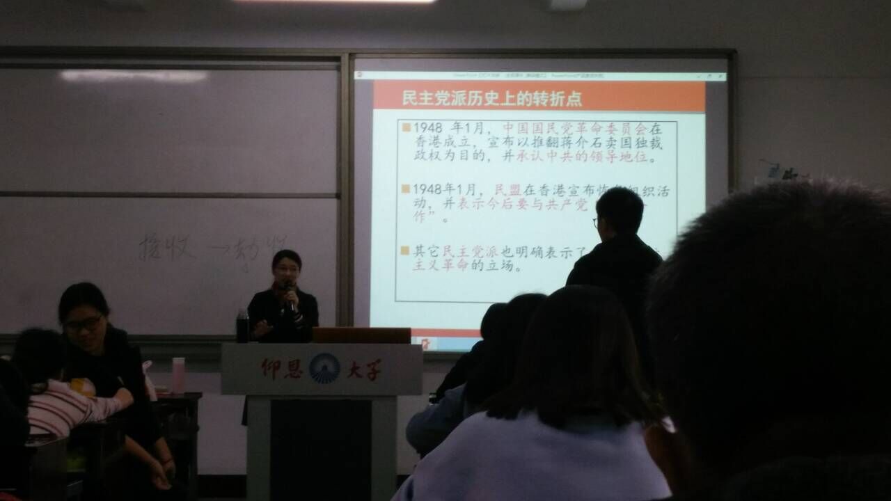 康丽颖老师第一节课讲授了教材“第七章 为新中国而奋斗”的相关内容,间或运用图片、影视资料等作为补充,生动的向同学们进行了讲解。她不仅内容娴熟、教态优雅、语言生动,而且和同学进行了较多的互动和交流。