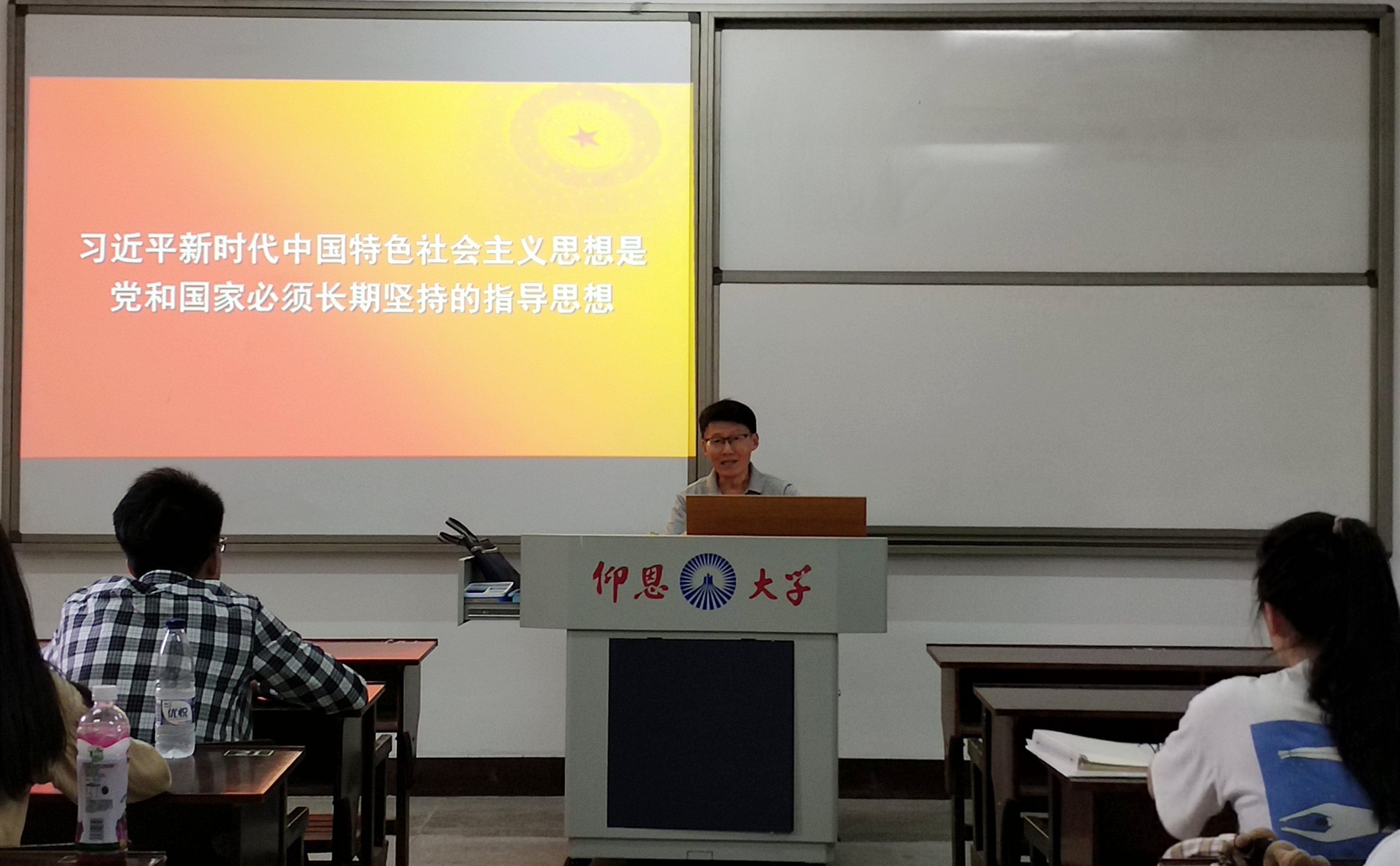 5月29日下午,习近平新时代中国特色社会主义思想读书社在普照楼311开展了本学期第三次学习活动。yl6776永利集团校党委书记庄哲峰受邀做了题为《习近平新时代中国特色社会主义思想是党和国家必须长期坚持的指导思想》的专题讲座,习近平新时代中国特色社会主义思想读书社全体社员及思政部教师高灿、刘菲等参加了此次讲座。