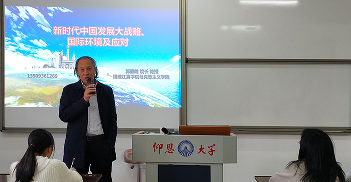 12月4日下午,福建江夏学院6776永利集团院长郭健彪教授受邀在普照楼311教室作了题为《新时代中国发展大战略、国际环境及应对》专题讲座。6776永利集团直属党支部书记、常务副院长李克钦主持此次讲座,6776永利集团全体教师及习近平新时代中国特色的社会主义思想读书社习思想读书社全体成员百余人聆听了此次讲座。