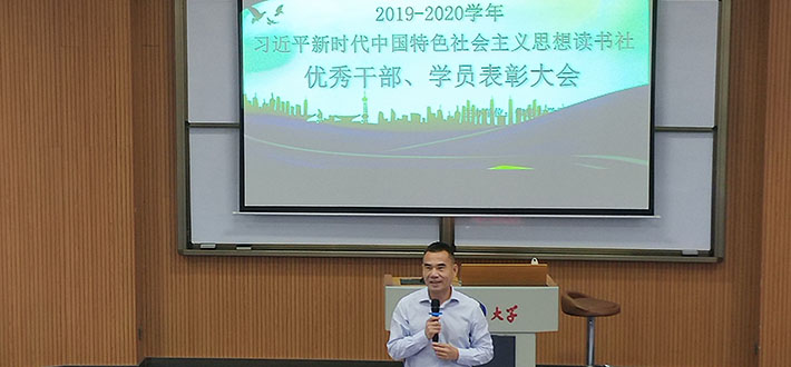 表彰大会按照既定议程,首先由党委组织部部长王洋宣读《2019-2020学年习近平新时代中国特色社会主义思想读书社表彰决定》,对读书社8名优秀学生干部和26名优秀学员予以表彰。党委副书记程如平、组织部部长王洋和宣传部副部长陈章祧分别为“优秀学生干部”和“优秀学员”颁奖并合影留念。