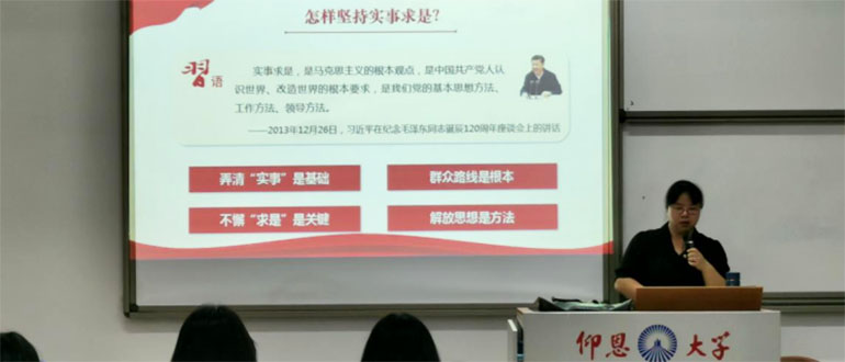 章老师以“坚持实事求是、坚持战略定力、坚持问题导向、坚持全面协调、坚持底线思维、坚持抓铁有痕、坚持调查研究、坚持历史担当”这八个方面展开具体讲述。她以“我们的任务是过河,但是没有桥或没有船就不能过。不解决桥或船的问题,过河就是一句空话”开篇,教导在座的同学要努力学习习总书记对广大青年大学生提出的如何把握和解决思想问题的方法和把握和解决实际问题的方法。她深入的对增强学习本领,在全党营造善于学习、勇于实践的浓厚氛围,建设马克思主义学习型政党,推动建设学习大国方面做了更深入的讲解。博得在场同学们的阵阵掌声!