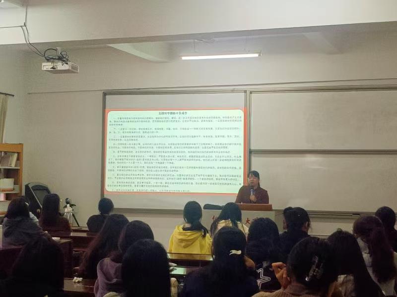 讲座伊始,章娇娜从国际和国内两个方面阐述了习近平总书记“青年观”的形成条件,引导学生认识到习近平总书记的“青年观”是在统筹中华民族伟大复兴战略全局和世界百年未有之大变局“两个大局”的时代背景下形成的。随后,章娇娜从青年是实现中国梦的先锋力量、青年要高举理想信念旗帜等几个方面系统介绍了习近平总书记的“青年观”。最后,从价值维度引导学生思考习近平总书记“青年观”的理论与现实意义。
