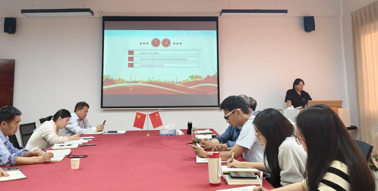 党支部书记章娇娜带领全院教师对2025年政府工作报告内容进行了学习,主要内容分为2024年工作回顾、2025年经济社会发展总体要求和政策取向、2025年政府工作任务三个模块展开。学习内容详细全面,不仅针对两会精神如何融入思想政治理论课教学给出了建议,还联系马克思主义的科学世界观与方法论对政府工作报告进行了分析和解读,尝试将会议精神与教学实际相结合,给全院教师提供了教学参考和启发。